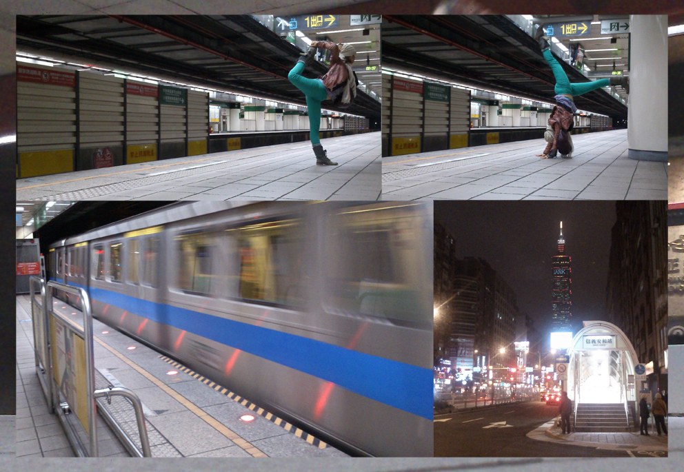 First time grabbing my foot, thanks to some fantastic advice by my friend and yoga teacher colleague Angela. In an underground metro station in Xindian district, New Taipei City, home at this time.
