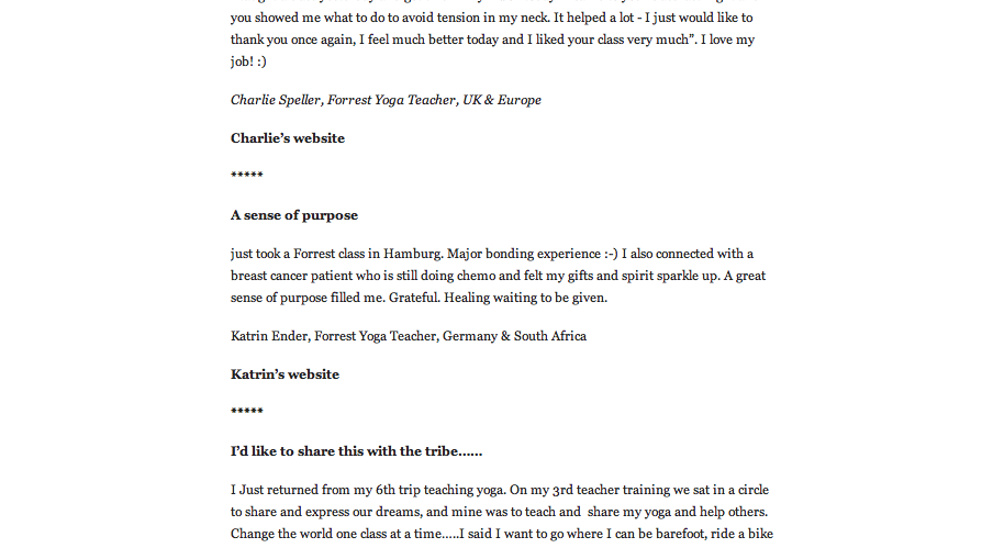 I’m very proud and honored to have been awarded the opportunity to write my first article about my experiences with Forrest Yoga for Yoga Journal Germany, Germany’s most popular Yoga magazine. http://yogajournal.de/style-guide-forrest-yoga/