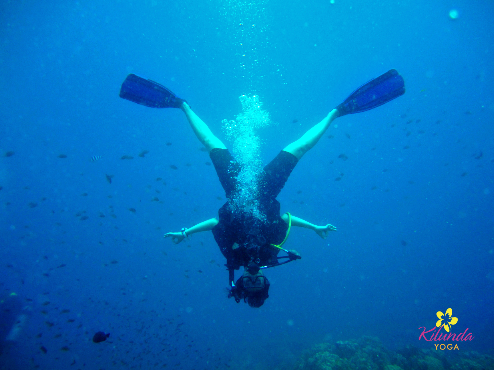 Underwater Yoga. My love for scuba diving developed because of the sense of Freedom I felt breathing underwater. That sensation of Freedom grew when I started to master my buoyancy. Teaching yoga to scuba divers has been my dream since I learnt scuba diving. Opening the body with breath and meditation before diving enhances your experience underwater. You see more, you connect more, you feel more. Expanding the breath and learning how to deliberately apply various breathing techniques also allows you to stay under water longer. Being underwater is like being in the womb. The environment resembles a space in meditation, when one travels to a time before one’s own conception. It’s a very spiritual space. And finally, the underwater puts your mental strength to the test and allows you to practice working with fear. You learn how to overcome panic through the control of your mind. That is why to me, Yoga and Scuba Diving are practices that enhance each other.