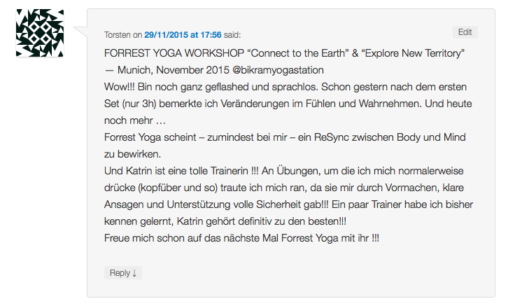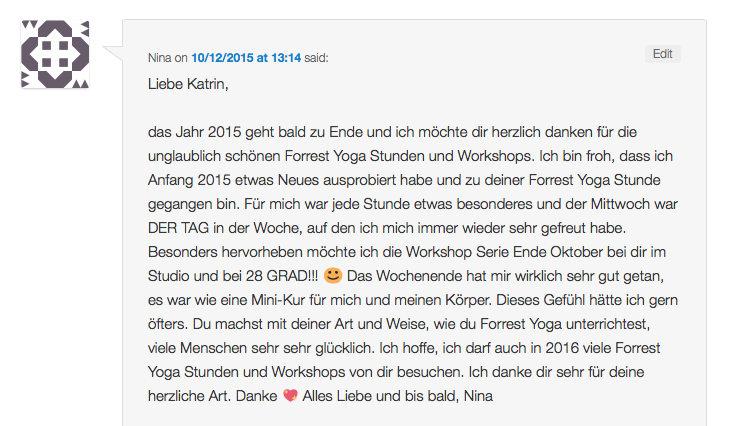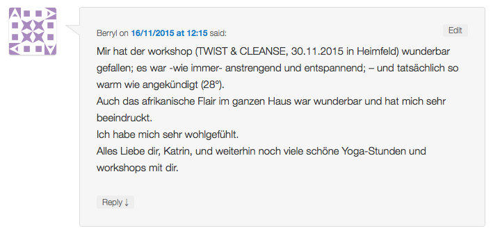 Yoga Testimonials © Kilunda, February 2016 Share this: Click to share on X (Opens in new window) X Click to share on Facebook (Opens in new window) Facebook Like Loading...